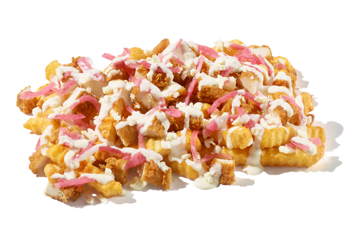A generous portion of Crinkle Fries topped with hand-breaded Fried Chicken, crumbled feta cheese, pickled red onions, and creamy Feta Sauce.