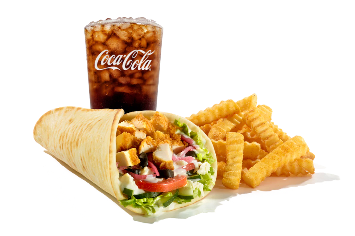 A Giant Chicken Finger Pita with 3 hand-breaded Chicken Fingerz, shredded lettuce, Roma tomatoes, cucumbers, pickled red onions, olives, crumbled feta cheese, and a drizzle of creamy Feta Sauce wrapped in a warm Pita. Served with Crinkle Fries and Small Drink. Also available with Grilled Chicken.