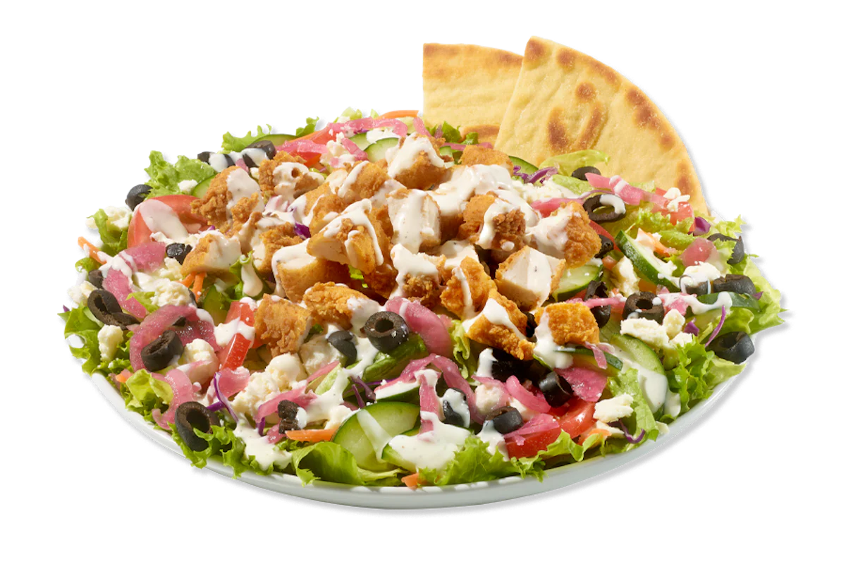 Mixed greens with carrots and red cabbage, Roma tomatoes, cucumbers, pickled red onions, olives, crumbled feta cheese, and a drizzle of creamy Feta Sauce with Fried or Grilled chicken and Greek Vinaigrette. Served with Pita Bread.